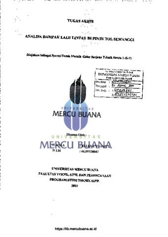 YUANITA, ELLENA (2011) ANALISA DAMPAK LALU LINTAS DI PINTU TOL SEMANGGI. S1 thesis, Universitas Mercu Buana Jakarta.