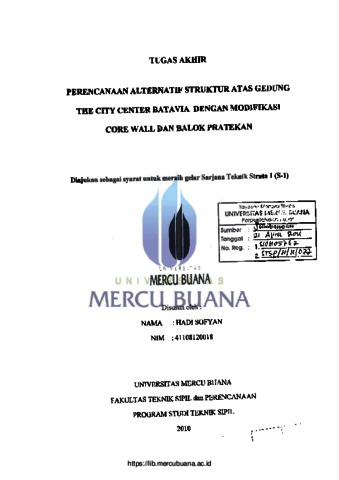 SOFYAN, HADI (2010) PERENCANAAN ALTERNATIF STRUKTUR ATAS GEDUNG THE CITY CENTER BATAVIA DENGAN MODIFIKASI CORE WALL DAN BALOK PRATEKAN. S1 thesis, Universitas Mercu Buana Jakarta.