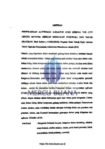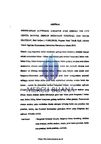 PERENCANAAN ALTERNATIF STRUKTUR ATAS GEDUNG THE CITY CENTER BATAVIA DENGAN MODIFIKASI COREWALL DAN BALOK PRATEKAN, Hadi Sofyan (41108120018), Program Studi Teknik Sipil, Fakultas Teknik Sipil dan Perencanaan, Universitas Mercubuana Jakarta 2010. Metode yang digunakan dalam mendesain gedung beton bertulang berlantai banyak adalah menentukan beban beban yang bekerja pada struktur bangunan (beban mati, beban hidup, beban komponen gedung tambahan, beban gempa), taksiran awal dalam menentukan dimensi untuk pelat lantai, balok, kolom dan corewall, taksiran awal dimensi ini dihitung berdasarkan beban beban yang bekerja pada desain awal bangunan, dikarenakan pada tugas akhir ini pelat lantai menggunakan pracetak sehingga seluruh beban akibat pelat cetak terdistribusi terhadap struktur balok dan UNIVERSI kolom, setelah itu pemodelan struktur bangunan dengan menggunakan software ETABS ETABS v.9.5.0 dengan hasil yaitu simpangan terbesar dari model struktur mes AYAEREH BUANA" yang dibuat, respon struktur akibat bekerjanya gaya luar/ beban pada bangunan (beban mati, beban hidup, beban komponen gedung tambahan, beban gempa). Perencanaan elemen struktur yaitu melakukan desain tulangan terhadap balok non pratekan dan pratekan, kolom, dan Corewall berdasarkan gaya-gaya dalam yang didaptkan dari software ETABS v.9.5.0. kata kunci : bangunan berlantai banyak, bangunan beton bertulang, taksiran awal dimensi, analisa struktur, desain, pelat lantai pracetak, balok non pratekan, balok pratekan, corewall,