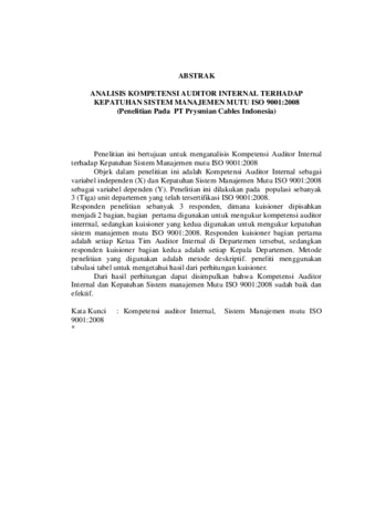 Penelitian ini bertujuan untuk menganalisis Kompetensi Auditor Internal terhadap Kepatuhan Sistem Manajemen mutu ISO 9001:2008 Objek dalam penelitian ini adalah Kompetensi Auditor Internal sebagai variabel independen (X) dan Kepatuhan Sistem Manajemen Mutu ISO 9001:2008 sebagai variabel dependen (Y). Penelitian ini dilakukan pada populasi sebanyak 3 (Tiga) unit departemen yang telah tersertifikasi ISO 9001:2008. Responden penelitian sebanyak 3 responden, dimana kuisioner dipisahkan menjadi 2 bagian, bagian pertama digunakan untuk mengukur kompetensi auditor interrnal, sedangkan kuisioner yang kedua digunakan untuk mengukur kepatuhan sistem manajemen mutu ISO 9001:2008. Responden kuisioner bagian pertama adalah setiap Ketua Tim Auditor Internal di Departemen tersebut, sedangkan responden kuisioner bagian kedua adalah setiap Kepala Departemen. Metode penelitian yang digunakan adalah metode deskriptif. peneliti menggunakan tabulasi tabel untuk mengetahui hasil dari perhitungan kuisioner. Dari hasil perhitungan dapat disimpulkan bahwa Kompetensi Auditor Internal dan Kepatuhan Sistem manajemen Mutu ISO 9001:2008 sudah baik dan efektif.