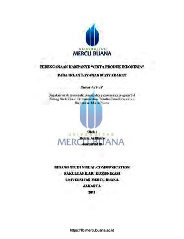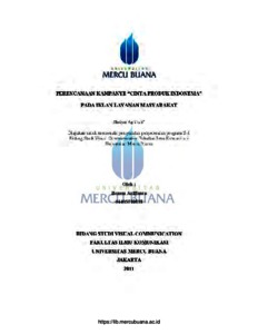 Arifianto, Bennu (2011) PERENCANAAN KAMPANYE "CINTA PRODUK INDONESIA" PADA IKLAN LAYANAN MASYARAKAT. S1 thesis, Universitas Mercu Buana.