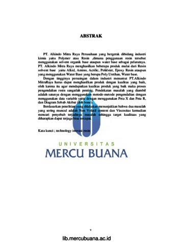 PT. Alkindo Mitra Raya Perusahaan yang bergerak dibidang industri kimia yaitu Polymer atau Resin ,dimana penggunaan resin tersebut menggunakan solvent organik base ataupun water base sebagai pelarutnya. PT. Alkindo Mitra Raya menghasilkan beberapa produk mulai dari Resin solvent base yaitu Alkid, Amino, Acrilic, Poliéster, Epoxy Resin ataupun yang menggunakan Water Base yang berupa Poly Urethan, Water base. Dengan tingginya persaingan dalam industri menuntut PT.Alkindo MitraRaya harus dapat menghasilkan produk dengan kualitas yang baik, oleh karena itu agar mendapatkan kualitas produk yang baik maka proses pengendalian resin sangatlah penting. Pendekatan masalah yang diambil adalah satunya dengan menggunakan metode-metode pengendalian dengan menggunakan data variable yaitu dengan menggunakan Peta X dan Peta R, dan Diagram Sebab Akibat (fish bone). Berdasarkan penelitian yang dilakukan menunjukkan bahwa dua masalah yang sering muncul adalah Non Volatil content dan Viscositas kemudian mencari penyebab terjadinya masalah sehingga target kualitaas yang diharapkan dapat terjaga bisa tercapai.