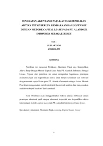 Penelitian ini mengenai Perlakuan Akuntansi Pajak atas Kepemilikan Aktiva Tetap Dengan Metode Capital Lease Pada PT. Alandcik Indonesia Sebagai Lessee. Tujuan dari penelitian ini untuk mengetahui bagaimana penerapan akuntansi pajak atas kepemilikan aktiva tetap berupa kendaraan dan software dengan metode capital lease pada PT. Alandick Indonesia sebagai lessee. Metode Penelitian menggunakan metode deskriptif dan metode analisis data menggunakan analisis deskriptif kualitatif dan kuantitatif. Hasil Penelitian akan menggambarkan bahwa adanya perbedaan antara penerapan akuntansi pajak dengan akuntansi komersial atas kepemilikan aktiva tetap dengan metode capital lease pada PT. Alandick Indonesia sebagai lessee