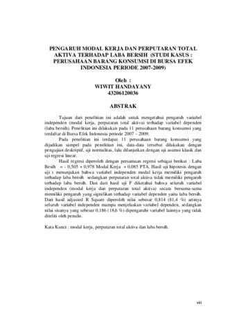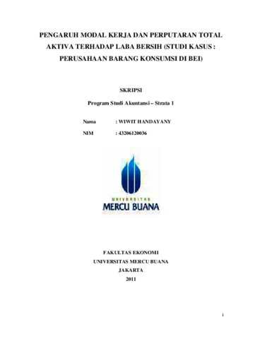 HANDAYANY, WIWIT (2011) PENGARUH MODAL KERJA DAN PERPUTARAN TOTAL AKTIVA TERHADAP LABA BERSIH (STUDI KASUS : PERUSAHAAN BARANG KONSUMSI DI BEI). S1 thesis, Universitas Mercu Buana Jakarta.