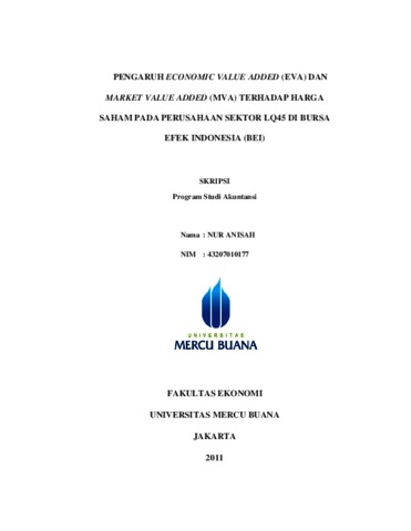 ANISAH, NUR (2011) PENGARUH ECONOMIC VALUE ADDED (EVA) DAN MARKET VALUE ADDED (MVA) TERHADAP HARGA SAHAM PADA PERUSAHAAN SEKTOR LQ45 DI BURSA EFEK INDONESIA (BEI). S1 thesis, Universitas Mercu Buana Jakarta.