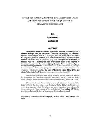 The job of a manager is to take appropriate decisions to company. For a financial manager, one job was to take decisions in analyzing the company's financial statement presentation. A manager financial first need to understand the company's financial condition. For understand it required an analysis of the financial statements used in companies they lead. One of the main objectives of financial decisions is maximize the level of prosperity owner of the company or shareholders, determine the amount of fringe benefits, determine the stock price, as well as assess performance to predict the state of the company in the future for its shareholders shares and prospective shareholders. This research was conducted with the aim of know the effect of Economic Value Added (EVA) and Market Value Added (MVA) against the company's stock price LQ45. Sampling method using a purposive sampling method, from four twentyfive companies, only thirteen companies were taken in succession are LQ45 sector who have the financial statements and stock prices fully period 2007-2009 The results showed that partially have no effect between Economic Value Added (EVA) to the stock price, while the Market Value Added (MVA) with stock prices have a partial effect. Correlation test shows that there is no relationship between Economic Value Added (EVA) and Market Value Added (MVA) with stock prices, because the level of closeness of the correlation is weak.