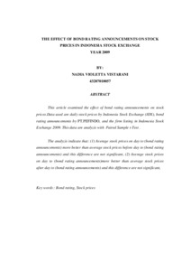 This article examined the effect of bond rating announcements on stock prices.Data used are daily stock prices by Indonesia Stock Exchange (IDX), bond rating announcements by PT.PEFINDO, and the firm listing in Indonesia Stock Exchange 2009. This data are analyzis with Paired Sample t-Test . The analyzis indicate that: (1) Average stock prices on day to (bond rating announcements) more better than average stock prices before day to (bond rating announcements) and this difference are not significant, (2) Average stock prices on day to (bond rating announcements)more better than average stock pr