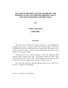 The research on the analysis of the effect of net income on cash dividends. The population in this study is a company registered as Property companies, Real Estate and Building Construction in Indonesian Stock Exchange (IDX). The purpose of this research to analysis the effect of net income on cash dividends. This research uses a simple linear regression analysis. The following are some criteria: Companies listed on the Indonesian Stock Exchange (IDX), Companies that make cash dividend payments in 2006 – 2008, Companiesthat earn net income in 2006 – 2008, Companies have the necessary data in the research, because complete data is data that is needed in research. The result of this research, a significant difference beetween the variabel X (Net Income) to variabel Y (Cash Dividend)