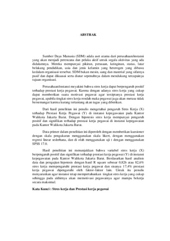 Sumber Daya Manusia (SDM) adala aset utama dari perusahaan/instansi yang akan menjadi perencana dan pelaku aktif untuk segala aktivitas yang ada didalamnya. Mereka mempunyai pikiran, perasaan, keinginan, status, latar belakang pendidikan, usia dan jenis kelamin yang heterogen yang dibawa kedalam organisasi tersebut. SDM bukan mesin, uang dan material yang sifatnya pasif dan dapat dikuasai serta diatur sepenuhnya dalam mendukung tercapainya tujuan organisasi. Perusahaan/instansi meyakini bahwa stres kerja dapat berpengaruh positif terhadap prestasi kerja pegawai. Karena dengan adanya stres kerja yang cukup dapat memberikan suatu motivasi pegawai agar terciptanya prestasi kerja pegawai, apabila tingkat stres kerja rendah maka pegawai juga akan merasa tidak bersemangat karena kurang tertantang akan tugas yang diberikan. Dari hasil penelitian ini penulis mengetahui pengaruh Stres Kerja (X) terhadap Prestasi Kerja Pegawai (Y) di instansi kepegawaian pada Kantor Walikota Jakarta Barat. Dengan hipotesis stres kerja mempunyai pengaruh positif dan signifikan terhadap prestasi kerja pegawai di instansi kepegawaian pada Kantor Walikota Jakarta Barat. Data primer dalam penelitian ini diperoleh dengan memberikan kuesioner dengan skala pengukuran menggunakan skala likert, dengan menggunakan regresi linear sederhana, dan di olah menggunakan uji t dengan menggunakan SPSS 17.0. Hasil penelitian ini menunjukkan bahwa variabel stres kerja (X) berpengaruh positif dan signifikan terhadap prestasi kerja pegawai (Y) di instansi kepegawaian pada Kantor Walikota Jakarta Barat. Berdasarkan hasil analisis data dan pengujian hipotesis dengan hasil R square sebesar 0,826 atau 82,6% stres kerja mempengaruhi prestasi kerja pegawai dan sisanya 17,4% prestasi kerja pegawai dipengaruhi oleh faktor-faktor lain. Untuk itu penulis menyarankan agar instansi tetap mempertahankan tingkat stres kerja yang cukup sehingga pada akhirnya akan memotivasi pegawainya agar mampu bekerja secara maksimal.
