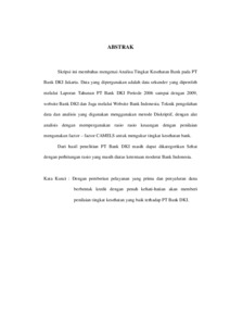 Skripsi ini membahas mengenai Analisa Tingkat Kesehatan Bank pada PT Bank DKI Jakarta. Data yang dipergunakan adalah data sekunder yang diperoleh melalui Laporan Tahunan PT Bank DKI Periode 2006 sampai dengan 2009, website Bank DKI dan Juga melalui Website Bank Indonesia. Teknik pengolahan data dan analisis yang digunakan menggunakan metode Diskriptif, dengan alat analisis dengan mempergunakan rasio rasio keuangan dengan penilaian mengunakan factor – factor CAMELS untuk mengukur tingkat kesehatan bank. Dari hasil penelitian PT Bank DKI masih dapat dikategorikan Sehat dengan perhitungan rasio yang masih diatas ketentuan moderat Bank Indonesia