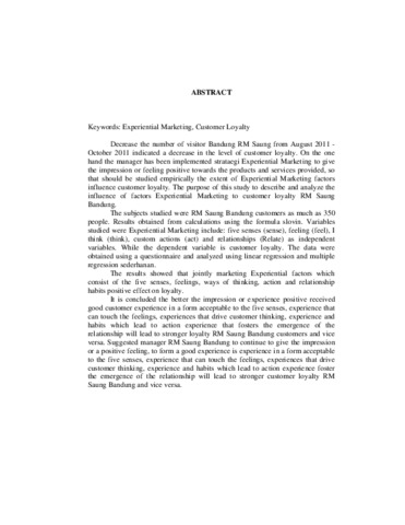 Penurunan jumlah pengunjung RM Saung Bandung dari bulan Agustus 2011 – oktober 2011 mengindikasikan adanya penurunan tingkat loyalitas pelanggan. Di satu sisi pihak pengelola sudah menerapkan strataegi Experiential Marketing untuk memberikan kesan atau feeling yang positif terhadap produk dan servis yang diberikan, sehingga perlu dikaji secara empiris sejauh mana faktor-faktor Experiential Marketing berpengaruh terhadap loyalitas pelanggan. Tujuan penelitian ini untuk mendeskripsikan dan menganalisis pengaruh faktor-faktor Experiential Marketing terhadap loyalitas pelanggan RM Saung Bandung. Subjek yang diteliti adalah pelanggan RM Saung Bandung sebanyak 350 orang. Hasil yang diperoleh dari perhitungan menggunakan rumus slovin. Variabel yang dikaji adalah Experiential Marketing meliputi: panca indera (sense), perasaan (feel), cara berpikir (think), tindakan kebiasaan (act) dan hubungan (relate) sebagai variabel bebas. Sedangkan variabel terikatnya adalah loyalitas pelanggan. Data diperoleh menggunakan kuesioner dan dianalisis menggunakan regresi linear sederhanan dan regresi berganda. Hasil penelitian menunjukkan bahwa secara bersama-sama faktor Experiential marketing yang terdiri dari panca indera, perasaan, cara berpikir, tindakan kebiasaan dan hubungan berpengaruh positif terhadap loyalitas. Disimpulkan semakin baik kesan atau pengalaman positif yang diterima pelanggan baik itu pengalaman dalam bentuk yang dapat diterima panca indera, pengalaman yang dapat menyentuh perasaan, pengalaman yang mendorong cara berpikir pelanggan, pengalaman yang menimbulkan tindakan kebiasaan serta pengalaman yang menumbuhkan munculnya hubungan akan menyebabkan semakin kuat loyalitas pelanggan RM Saung Bandung begitu juga sebaliknya. Disarankan pengelola RM Saung Bandung untuk tetap memberikan kesan atau suatu feeling yang positif untuk membentuk suatu pengalaman baik itu pengalaman dalam bentuk yang dapat diterima panca indera, pengalaman yang dapat menyentuh perasaan, pengalaman yang mendorong cara berpikir pelanggan, pengalaman yang menimbulkan tindakan kebiasaan serta pengalaman yang menumbuhkan munculnya hubungan akan menyebabkan semakin kuat loyalitas pelanggan RM Saung Bandung begitu juga sebaliknya