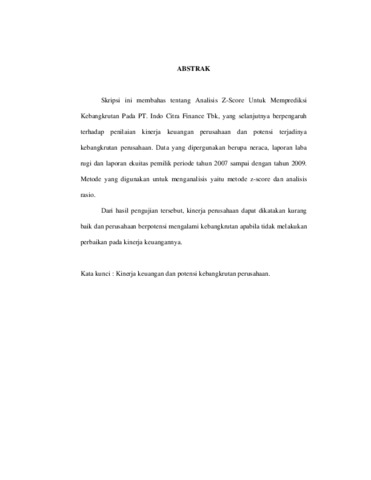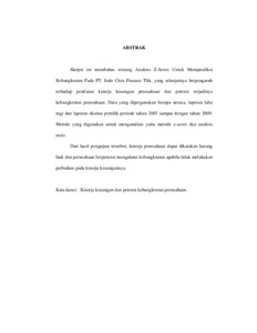 Skripsi ini membahas tentang Analisis Z-Score Untuk Memprediksi Kebangkrutan Pada PT. Indo Citra Finance Tbk, yang selanjutnya berpengaruh terhadap penilaian kinerja keuangan perusahaan dan potensi terjadinya kebangkrutan perusahaan. Data yang dipergunakan berupa neraca, laporan laba rugi dan laporan ekuitas pemilik periode tahun 2007 sampai dengan tahun 2009. Metode yang digunakan untuk menganalisis yaitu metode z-score dan analisis rasio. Dari hasil pengujian tersebut, kinerja perusahaan dapat dikatakan kurang baik dan perusahaan berpotensi mengalami kebangkrutan apabila tidak melakukan perbaikan pada kinerja keuangannya.