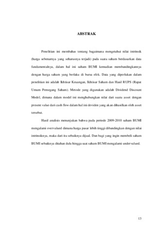 Penelitian ini membahas tentang bagaimana mengetahui nilai intrinsik (harga sebenarnya yang seharusnya terjadi) pada suatu saham berdasarkan data fundamentalnya, dalam hal ini saham BUMI kemudian membandingkannya dengan harga saham yang berlaku di bursa efek. Data yang diperlukan dalam penelitian ini adalah Ikhtisar Keuangan, Ikhtisar Saham dan Hasil RUPS (Rapat Umum Pemegang Saham). Metode yang digunakan adalah Dividend Discount Model, dimana dalam model ini menghubungkan nilai dari suatu asset dengan present value dari cash flow dalam hal ini deviden yang akan dihasilkan oleh asset tersebut. Hasil analisis menunjukan bahwa pada periode 2009-2010 saham BUMI mengalami overvalued dimana harga pasar lebih tinggi dibandingkan dengan nilai intrinsiknya, maka dari itu sebaiknya dijual. Dan bagi yang ingin membeli saham BUMI sebaiknya ditahan dulu hingga saat saham BUMI mengalami undervalued.
