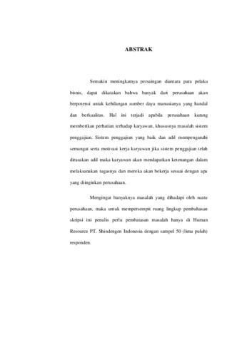 Semakin meningkatnya persaingan diantara para pelaku bisnis, dapat dikatakan bahwa banyak dari perusahaan akan berpotensi untuk kehilangan sumber daya manusianya yang handal dan berkualitas. Hal ini terjadi apabila perusahaan kurang memberikan perhatian terhadap karyawan, khususnya masalah sistem penggajian. Sistem penggajian yang baik dan adil mempengaruhi semangat serta motivasi kerja karyawan jika sistem penggajian telah dirasakan adil maka karyawan akan mendapatkan ketenangan dalam melaksanakan tugasnya dan mereka akan bekerja sesuai dengan apa yang diinginkan perusahaan. Mengingat banyaknya masalah yang dihadapi oleh suatu perusahaan, maka untuk mempersempit ruang lingkup pembahasan skripsi ini penulis perlu pembatasan masalah hanya di Human Resource PT. Shindengen Indonesia dengan sampel 50 (lima puluh) responden
