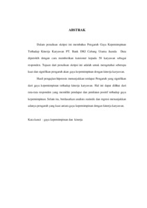 Dalam penulisan skripsi ini membahas Pengaruh Gaya Kepemimpinan Terhadap Kinerja Karyawan PT. Bank DKI Cabang Utama Juanda Data diperoleh dengan cara memberikan kuisioner kepada 50 karyawan sebagai responden. Tujuan dari penulisan skripsi ini adalah untuk mengetahui seberapa kuat dan signifikan pengaruh akan gaya kepemimpinan dengan kinerja karyawan. Hasil pengujian hipotesis menunjukkan terdapat Pengaruh yang signifikan dari gaya kepemimpinan terhadap kinerja karyawan. Hal ini dapat dilihat dari rata-rata responden yang memiliki pendapat dan penilaian positif terhadap gaya kepemimpinan. Selain itu, berdasarkan analisis statistik dan regresi menunjukkan adanya pengaruh yang kuat antara gaya kepemimpinan dengan kinerja karyawan.