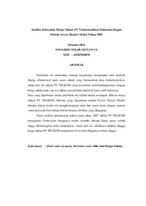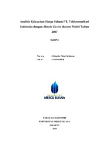 Penelitian ini membahas tentang bagaimana mengetahui nilai intristik (harga sebenarnya) pada suatu saham yang berdasarkan data fundamentalnya, dalam hal ini saham PT TELKOM yang kemudian membandingkannya dengan harga saham pada saat itu (tahun yang penulis pakai) di bursa efek Indonesia. Data yang diperlukan dalam penelitian ini adalah iktisar keuangan, ikhtisar harga saham PT TELKOM. Metode yang digunakan adalah Excess Return Model, dimana dalam model ini menghubungkan nilai dari suatu asset dengan present value dari cash flow dalam hal ini besaran deviden yang dibagikan. Hasil analisis menunjukan bahwa pada tahun 2007 saham PT TELKOM mengalami Undervalue (harganya terlalu rendah) dimana harga pasar terlalu tinggi dibandingkan nilai intrinsiknya, maka dari itu sebaiknya ditahan hingga harga saham PT TELKOM mengalami Overvalue (harganya terlalu tinggi)