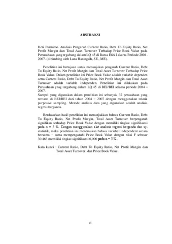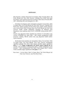 PURNOMO, HERI (2011) ANALISIS PENGARUH CURRENT RATIO, DEBT TO EQUITY RATIO, NET PROFIT MARGIN, DAN TOTAL ASSET TURNOVER TERHADAP PRICE BOOK VALUE PADA PERUSAHAAN YANG TERGABUNG DALAM LQ 45 DI BURSA EFEK INDONESIA PERIODE 2004-2007. S1 thesis, Universitas Mercu Buana Jakarta.