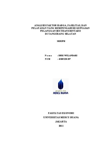 WULANDARI, DERI (2011) ANALISIS FAKTOR HARGA, FASILITAS, DAN PELAYANAN YANG MEMPENGARUHI KEPUASAN PELANGGAN BIS TRANS BINTARO DI TANGERANG SELATAN. S1 thesis, Universitas Mercu Buana Jakarta.