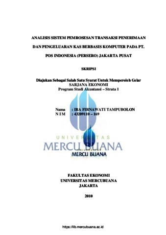 Tampubolon, Ira Firnawati (2011) ANALISIS SISTEM PEMROSESAN TERANSAKSI PENERIMAAN DAN PENGELUARAN KAS BERBASIS KOMPUTER PADA PT.POS INDONESIA (Persero) JAKARTA PUSAT. S1 thesis, Universitas Mercu Buana.