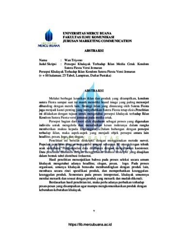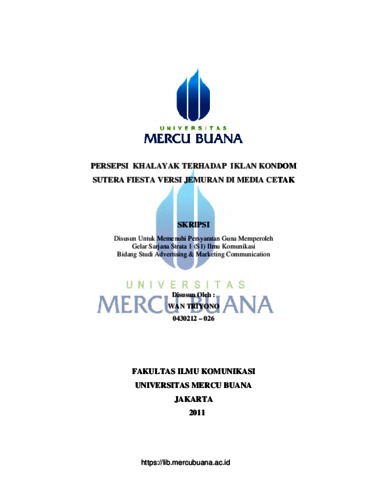 TRIYONO, WAN (2010) PERSEPSI KHALAYAK TERHADAP IKLAN KONDOM SUTERA FIESTA VERSI JEMURAN DI MEDIA CETAK. S1 thesis, Universitas Mercu Buana Jakarta.