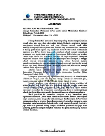 KESUMA, ANDINI ANGGI (2011) STRATEGI KOMUNIKASI PEMASARAN BINUS CENTER DALAM MEMASARKAN FRANCHISE BINUS CENTER PERIODE 2008. S1 thesis, Universitas Mercu Buana Jakarta.