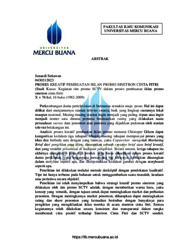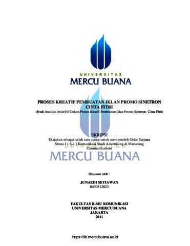 SETIAWAN, JUNAEDI (2011) PROSES KREATIF PEMBUATAN IKLAN PROMO SINETRON CINTA FITRI. S1 thesis, Universitas Mercu Buana Jakarta.