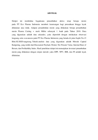 Skripsi ini membahas bagaimana penambahan aktiva tetap berupa mesin pada PT Eco Plasma Indonesia memberi keuntungan bagi perusahaan hingga layak dilakukan atau tidak. Adapun penambahan mesin yang dilakukan berupa penambahan mesin Plasma Cutting + merk Miller sebanyak 1 buah pada Tahun 2010. Data yang digunakan adalah data sekunder, yaitu diperoleh dengan melakukan observasi langsung serta wawancara pada PT Eco Plasma Indonesia yang berada di jalan Suplir No.15 Blok H2 BSD tangerang. Teknik analisis data yang digunakan adalah Metode Capital Budgeting, yang terdiri dari Discounted Payback Period, Net Present Value, Internal Rate of Return, dan Profitability Index. Hasil penelitian skripsi ini menunjukan investasi penambahan mesin yang dilakukan dengan empat metode yaitu DPP, NPV, IRR, dan PI adalah layak dilakukan.