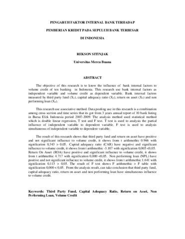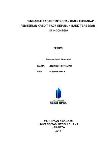 SITINJAK, REKSON (2011) PENGARUH FAKTOR INTERNAL BANK TERHADAP PEMBERIAN KREDIT PADA SEPULUH BANK TERBESAR DI INDONESIA. S1 thesis, Universitas Mercu Buana Jakarta.