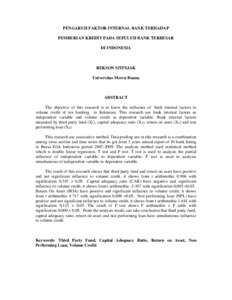 The objective of this research is to know the influence of bank internal factors to volume credit of ten banking in Indonesia. This research use bank internal factors as independent variable and volume credit as dependent variable. Bank internal factors measured by third party fund (X1), capital adequacy ratio (X2), return on asset (X3) and non performing loan (X4). This research use associative method. Data pooling use in this research is a combination among cross section and time series that its got from 3 years annual report of 10 bank listing in Bursa Efek Indonesia period 2007-2009. The analysis method used statistical method which is double linear regression, T test and F test. T test is used to analysis the partial influence of independent variable to dependent variable. F test is used to analysis simultaneous of independent variable to dependent variable. The result of this research shows that third party fund and return on asset have positive and not significant influence to volume credit, it shows from t arithmethic 0.966 with signification 0,343 > 0,05. Capital adequacy ratio (CAR) have negative and significant influence to volume credit, it shows from t arithmethic -3.107 with signification 0,005 <0,05. Return On Asset (ROA) have positive and significant influence to volume credit, it shows from t arithmethic 4.717 with signification 0,000 <0,05. Non performing loan (NPL) have positive and not significant influence to volume credit, it shows from t arithmethic 1.641 with signification 0,113 > 0,05. The result of F test shows F arithmethic > F table with signification 0,000 < 0,05. From the analysis result, can take conclusion that third party fund, capital adequacy