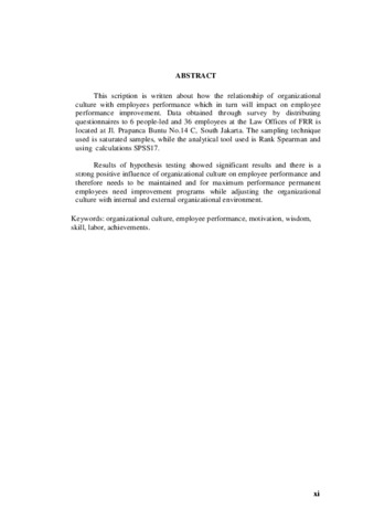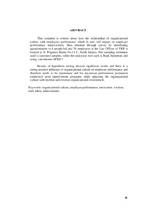 kripsi ini membahas bagaimana hubungan budaya organisasi dengan kinerja karyawan yang selanjutnya akan berdampak terhadap peningkatan kinerja karyawan. Data diperoleh melalui survey dengan menyebarkan kuesioner kepada 3 orang orang pimpinan dan 19 karyawan di Kantor Hukum FRR yang beralamat di Jl. Prapanca Buntu No.14 C, Jakarta selatan. Teknik pengambilan sampel yang digunakan adalah sampel jenuh, sedangkan alat analisis yang digunakan adalah Rank Spearman dan menggunakan penghitungan SPSS 17. Hasil pengujian hipotesis menunjukkan hasil yang signifikan dan terdapat pengaruh positif yang kuat antara budaya organisasi terhadap kinerja karyawan oleh karena itu perlu dipertahankan dan agar kinerja karyawan tetap maksimal perlu peningkatan program-program budaya organisasi.