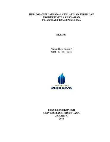 PANJAITAN, RIRIS FRISKA (2011) HUBUNGAN PELAKSANAAN PELATIHAN TERHADAP PRODUKTIVITAS KARYAWAN PT. ASPHALT BANGUN SARANA. S1 thesis, Universitas Mercu Buana Jakarta.