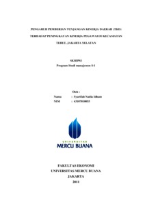 IDHAM, SYARIFAH NADIA (2011) PENGARUH PEMBERIAN TUNJANGAN KINERJA DAERAH (TKD) TERHADAP PENINGKATAN KINERJA PEGAWAI DI KECAMATAN TEBET, JAKARTA SELATAN. S1 thesis, Universitas Mercu Buana Jakarta.