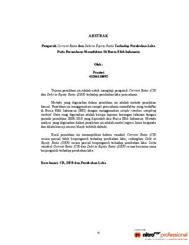 PRASIWI, PRASIWI (2012) PENGARUH CURRENT RATIO DAN DEBT TO EQUITY RATIO TERHADAP PERUBAHAN LABA PADA PERUSAHAAN MANUFAKTUR DI BURSA EFEK INDONESIA. S1 thesis, Universitas Mercu Buana Jakarta.