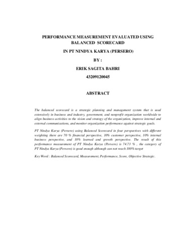 The balanced scorecard is a strategic planning and management system that is used extensively in business and industry, government, and nonprofit organization worldwide to align business activities to the vision and strategy of the organization, improve internal and external communications, and monitor organization performance against strategic goals. PT Nindya Karya (Persero) using Balanced Scorecard in four perspectives with different weighting there are 70 % financial perspective, 10% customer perspective, 10% internal business perspective, and 10% learned and growth perspective. The result of this performance measurement of PT Nindya Karya (Persero) is 74.73 % , the category of PT Nindya Karya (Persero) is good enough although can not reach 100% target