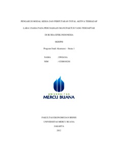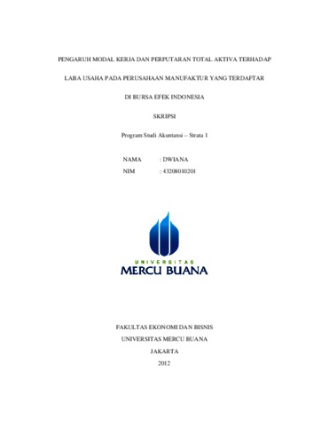 DWIANA, DWIANA (2012) PENGARUH MODAL KERJA DAN PERPUTARAN TOTAL AKTIVA TERHADAP LABA USAHA PADA PERUSAHAAN MANUFAKTUR YANG TERDAFTAR DI BURSA EFEK INDONESIA. S1 thesis, Universitas Mercu Buana Jakarta.