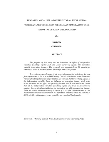 The purpose of this study was to determine the effect of independent variables (working capital and total assets turnover) against the dependent variable (operating income). The research was conducted on 38 manufactur companies listed in Indonesia Stock Exchange 2009-2010 period. Regression results obtained by the regression equation as follows: Income from operations = 2,424 + 0,586Working Capital + 0,186otal Asset Turnover. The results of hypothesis testing with the t test showed that the working capital of the independent variables have an influence on operating income, while total assets turnover has no effect on operating income. And F test results are known that all the independent variables (working capital and total assets turnover) together have a significant effect on the dependent variable is operating income. From the results obtained value of R Square of 0,341 (34,1%) means that all the independent variables could explain the dependent variable, while the rest are at 0,659 (65,9%) influenced by other variables not examined by the author.