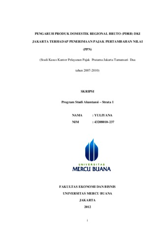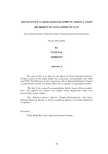 Penelitian ini bertujuan untuk mengetahui pengaruh Produk Domestik Regional Bruto (PDRB) terhadap penerimaan Pajak Pertambahan Nilai (PPN),secara parsial tahun 2007-2010. Variabel yang digunakan dalam penelitian ini adalah Produk Domestik Regional Bruto (PDRB) sebagai variabel independen dan Penerimaan Pajak Pertambahan Nilai sebagai variabel Dependen. Jenis data dari penelitian ini adalah data kuantitatif dengan menggunakan data sekunder. Statistik uji yang digunakan adalah Regresi Linier Sederhana. Data diproses dengan menggunakan metode kausal. Penelitian ini membuktikan bahwa jumlah Produk Domestik Regional Bruto (PDRB) tidak mempunyai pengaruh yang signifikan terhadap penerimaan Pajak Pertambahan Nilai (PPN).