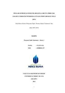 YULIYANA, YULIYANA (2012) PENGARUH PRODUK DOMESTIK REGIONAL BRUTO (PDRB) DKI JAKARTA TERHADAP PENERIMAAN PAJAK PERTAMBAHAN NILAI (PPN) (Studi Kasus Kantor Pelayanan Pajak Pratama Jakarta Tamansari Dua tahun 2007-2010). S1 thesis, Universitas Mercu Buana Jakarta.