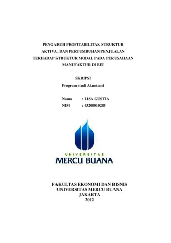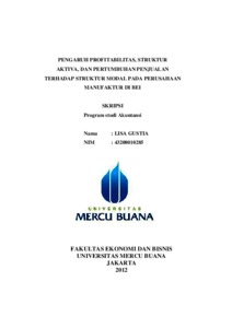 GUSTIA, LISA (2012) PENGARUH PROFITABILITAS, STRUKTUR AKTIVA, DAN PERTUMBUHAN PENJUALAN TERHADAP STRUKTUR MODAL PADA PERUSAHAAN MANUFAKTUR DI BEI. S1 thesis, Universitas Mercu Buana Jakarta.