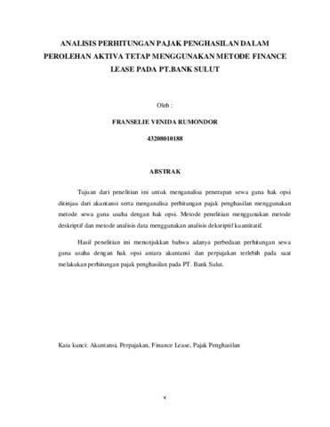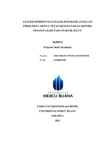 RUMONDOR, FRANSELIE VENIDA (2012) ANALISIS PERHITUNGAN PAJAK PENGHASILAN DALAM PEROLEHAN AKTIVA TETAP MENGGUNAKAN METODE FINANCE LEASE PADA PT. BANK SULUT. S1 thesis, Universitas Mercu Buana Jakarta.