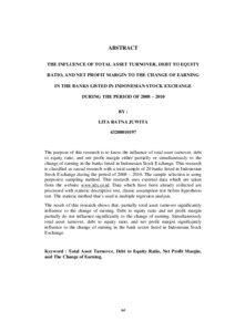 Penelitian ini bertujuan untuk mengetahui apakah total asset turnover, debt to equity ratio, dan net profit margin baik secara parsial maupun simultan berpengaruh terhadap perubahan laba pada perbankan umum yang terdaftar di Bursa Efek Indonesia. Penelitian ini merupakan penelitian kausal dengan jumlah sampel sebanyak 20 bank yang terdaftar di Bursa Efek Indonesia selama periode 2008 -2010. Pemilihan sampel dilakukan dengan menggunakan metode purposive sampling. Data yang digunakan adalah data eksternal, yang diperoleh dari situs www.idx.co.id. Proses analisis data yang dilakukan terlebih dahulu adalah uji statistik deskriptif, uji asumsi klasik, dan selanjutnya dilakukan pengujian hipotesis. Metode statistik yang digunakan adalah regresi linear berganda. Hasil penelitian menunjukan bahwa secara parsial, total asset turnover secara parsial berpengaruh signifikan terhadap perubahan laba. Debt to equity ratio dan net profit margin secara parsial tidak berpengaruh secara signifikan terhadap perubahan laba. Secara simultan total asset turnover, debt to equity ratio, dan net profit margin berpengaruh signifikan terhadap perubahan laba pada sektor bank yang terdaftar di Bursa Efek Indonesia