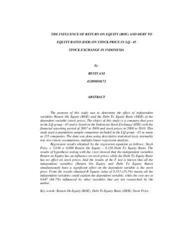 he purpose of this study was to determine the effect of independent variables Return On Equity (ROE) and the Debt To Equity Ratio (DER) of the dependent variable (stock price). The object of this study is a company that goes in the LQ group - 45 and is listed on the Indonesia Stock Exchange (IDX) with the financial reporting period of 2007 to 2009 and stock prices in 2008 to 2010. This study used a population sample companies included in the LQ group - 45 as many as 135 companies. The data was done using descriptive statistical tests, normality test, test classic assumptions, multiple linear regression analysis. Regression results obtained by the regression equation as follows: Stock Price = 5.036 + 0.888 Return On Equity – 0.130 Debt To Equity Ratio. The results of hypothesis testing with the t test showed that the independent variables Return on Equity has an influence on stock prices while the Debt To Equity Ratio has no effect on stock prices. And the results of the F test is known that all the independent variables (Return On Equity and Debt To Equity Ratio) simultaneously have a significant effect on the dependent variable is the stock price. From the results obtained R Square value of 0.353 (35.3%) means all the independent variables could explain the dependent variable, while the rest are at 0.647