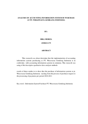 This reserach was about determine that the implementation of accounting information systems purchasing at PT. Wiraswasta Gemilang Indonesia is in conformity with accounting information systems in commons. This research was using of the descriptive qualitative data analysis methods results of these studies is to show that the purchase of information systems at pt. Wiraswasta Gemilang Indonesia starting from the process of purchase request to the processing of payments per period 2010-2011