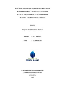 ANISSA, INA (2012) PENGARUH SIKAP WAJIB PAJAK ORANG PRIBADI DAN PEMERIKSAAN PAJAK TERHADAP KEPATUHAN WAJIB PAJAK (STUDI KASUS : DI WILAYAH KPP PRATAMA JAKARTA TAMAN SARI DUA). S1 thesis, Universitas Mercu Buana Jakarta.