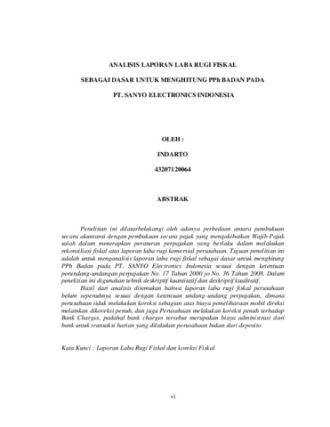 Penelitian ini dilatarbelakangi oleh adanya perbedaan antara pembukuan secara akuntansi dengan pembukuan secara pajak yang mengakibatkan Wajib Pajak salah dalam menerapkan peraturan perpajakan yang berlaku dalam melakukan rekonsiliasi fiskal atas laporan laba rugi komersial perusahaan. Tujuan penelitian ini adalah untuk menganalisis laporan laba rugi fiskal sebagai dasar untuk menghitung PPh Badan pada PT. SANYO Electronics Indonesia sesuai dengan ketentuan perundang-undangan perpajakan No. 17 Tahun 2000 jo No. 36 Tahun 2008. Dalam penelitian ini digunakan tehnik deskriptif kuantitatif dan deskriptif kualitatif. Hasil dari analisis ditemukan bahwa laporan laba rugi fiskal perusahaan belum sepenuhnya sesuai dengan ketentuan undang-undang perpajakan, dimana perusahaan tidak melakukan koreksi sebagian atas biaya pemeliharaan mobil direksi melainkan dikoreksi penuh, dan juga Perusahaan melakukan koreksi penuh terhadap Bank Charges, padahal bank charges tersebut merupakan biaya administrasi dari bank untuk transaksi harian yang dilakukan perusahaan bukan dari deposito.