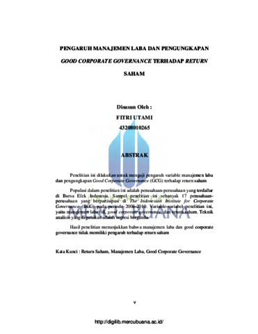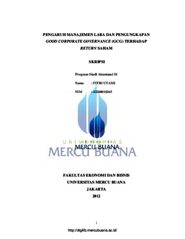UTAMI, FITRI (2012) PENGARUH MANAJEMEN LABA DAN PENGUNGKAPAN GOOD CORPORATE GOVERNANCE (GCG) TERHADAP RETURN SAHAM. S1 thesis, Universitas Mercu Buana Jakarta.
