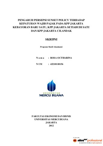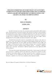 OCTHARINA, ROSA (2012) PENGARUH PERSEPSI SUNSET POLICY TERHADAP KEPATUHAN WAJIB PAJAK PADA KPP JAKARTA KEBAYORAN BARU SATU, KPP JAKARTA SETIABUDI SATU DAN KPP JAKARTA CILANDAK. S1 thesis, Universitas Mercu Buana Jakarta.