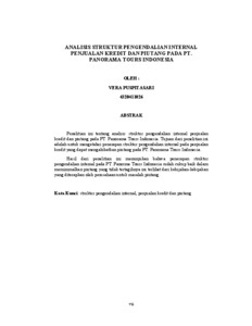 Penelitian ini tentang analisis struktur pengendalian internal penjualan kredit dan piutang pada PT. Panorama Tours Indonesia. Tujuan dari penelitian ini adalah untuk mengetahui penerapan struktur pengendalian internal pada penjualan kredit yang dapat mengakibatkan piutang pada PT. Panorama Tours Indonesia. Hasil dari penelitian ini menunjukan bahwa penerapan struktur pengendalian internal pada PT. Panorma Tours Indonesia sudah cukup baik dalam meminimalkan piutang yang tidak tertagihnya ini terlihat dari kebijakan-kebijakan yang diterapkan oleh perusahaan untuk masalah piutang.
