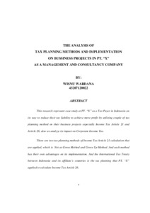 his research represent case study at PT. “X” as a Tax Payer in Indonesia on its way to reduce their tax liability to achieve more profit by utilizing couple of tax planning method on their business projects especially Income Tax Article 21 and Article 26, also we analyze its impact on Corporate Income Tax. There are two tax planning methods of Income Tax Article 21 calculation that are applied, which is Net as Gross Method and Gross Up Method. And each method has their own advantages on its implementation. And the International Tax Treaty between Indonesia and its affiliate’s countries is the tax planning that PT. “X” applied to calculate Income Tax Article 26. This research was derived in a descriptive analytic methodology, with data collecting techniques in form of bibliographical study and field study. The analysis performed is qualitative in nature. A conclusion drawn from this research is that the tax planning of PT. “X” complies with existing Indonesia Tax Law and Rules, referred to as tax avoidance and utilizing the gaps (loopholes) contained in it. And it has proven can improve the tax efficiency and the tax saving which is improving the overall company cash flow