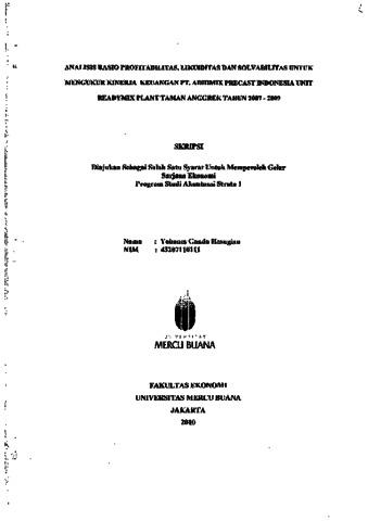HASUGIAN, YOHANES GANDA (2012) ANALISIS RASIO PROFITABILITAS, LIKUIDITAS DAN SOLVABILITAS UNTUK MENGUKUR KINERJA KEUANGAN PT. ADHIMIX PRECAST INDONESIA UNIT READYMIX PLANT TAMAN ANGGREK TAHUN 2007-2009. S1 thesis, Universitas Mercu Buana Jakarta.